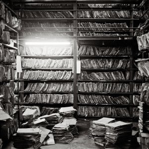 Kaksi vuotta sitten Venetsian biennaalissa rakastuin. Eräällä pitkällä seinällä oli pieniä mustavalkoisia valokuvia, jotka esittivät paperikasoja, huoneita täynnä naruilla sidottuja kansioita, kirjoja ja säkeittäin niputettuja asiakirjoja, laatikoita, hyllyjä ja arkistokaappeja. En päässyt näyttelyssä eteenpäin, vaan juutuin noiden kuvien ääreen.